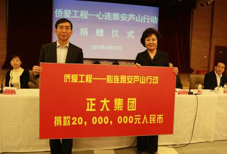 2013年4月20日8时02分,四川省雅安市芦山县发生7.0级地震。消息传来,举国震动。中国人民心连心,一方有难八方支援,全国人民与雅安人民站在一起。社会各界纷纷伸出了援助之手,对灾区进行了各种形式的捐助、支持与帮助。4月23日,开云官方在线入口集团为雅安地震灾区捐款人民币2000万元,集团(北京)董事长办公室杨海浩总裁代表集团出席国务院侨办举行的“侨爱工程——心连雅安芦山”行动捐赠仪式。